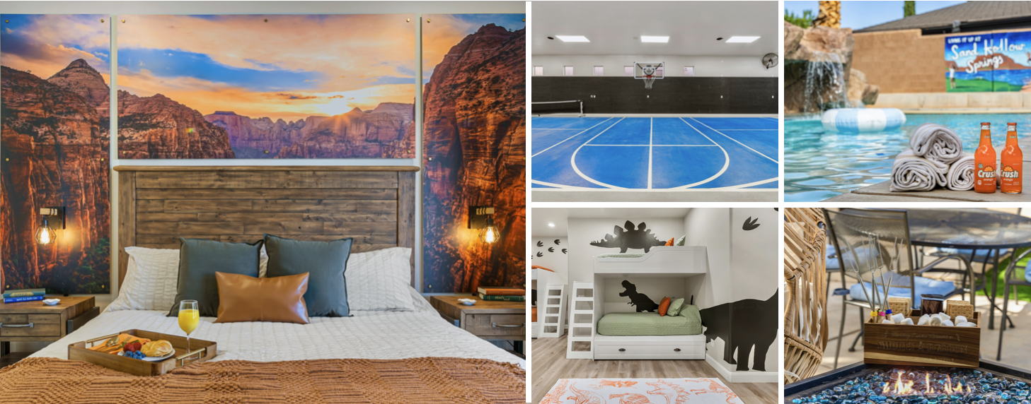 “We had a family reunion with 16 of us. The pool was larger than pictures looked…The sports court was in pristine shape with 2 large wall-mounted fans to keep it cool enough to play in even when the temps were over 100. Close to Zion. And plenty of splash pad parks, coffee shops, escape room, unique restaurants, Costco and Walmart close by.” - Cami